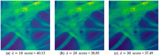 When applying IQA to the overall image denoising, we need the scores in the whole set of images and select the images with the highest scores to achieve the goal of improving image quality. We used two different pCLE images for the test, and the figure shows the score results for each image. It can be seen that the trend of the scores increases regularly and then decreases so that the image will be recovered best in a certain recovery process, as shown in Figure 8, and the figure also verifies this property. There is a certain difference in the optimal number of iterations for different images, which reflects that our need to add a quality assessment network is necessary; for example, if the number of iterations is set to 1200, image1 can achieve better results, but the other is not the best for recovery.