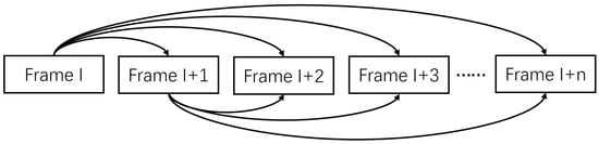 In order to achieve precise inter-frame matching pairs while generating more overlapping areas, it is important to ensure that the local RPCA segments are more comprehensive foreground objects. Inter-frame matching extends to each image with its next n frames, as shown in Figure 2. The projection transformation error is calculated for each frame with its next n frames, and the matching pair with the largest error value will be rejected, as shown in Equation (4):
