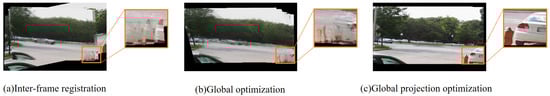 Panoramic background image: (a) shows the panoramic image obtained by inter-frame alignment only, (b) shows the panoramic image after global optimization, and (c) shows the panoramic image after global optimization and residual transformation.