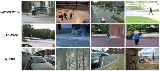 The datasets used in this study are the publicly available CDNET2014 dataset, FBMS-59 dataset, and CBD dataset. They can be downloaded at the following links: (1) CDNET2014 dataset (http://www.changedetection.net/, (accessed on 15 February 2023)), (2) FBMS-59 dataset (https://lmb.informatik.uni-freiburg.de/resources/datasets/, (accessed on 15 February 2023)), (3) CBD dataset (https://vis-www.cs.umass.edu/motionSegmentation/complexBgVideos.html, (accessed on 15 February 2023)).