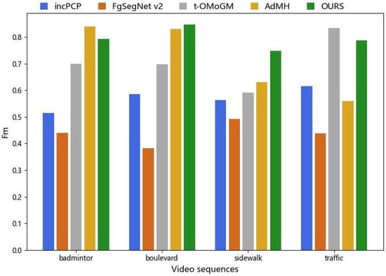 Additionally, we specifically analyze the impact of the camera jitter and perform performance analysis using four camera jitter video sequences from the CDNET2014 dataset: badminton, boulevard, sidewalk, and traffic. The quantitative comparative analysis results are shown in Figure 8. According to Figure 8, our proposed method demonstrates favorable performance on the jitter video sequences. Compared with other methods, our approach achieves Fm values above 0.7 for each video sequence class, with an average value of 0.7962, showing a better detection performance. In contrast, the values obtained from AdMH indicate the instability of its detection performance. When there is significant camera jitter and image frame blur in a video, as seen in the “sidewalk” example, the detection performance of most algorithms suffers. In contrast, our proposed method maintains a relatively stable detection level overall.