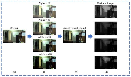 Performance tests with different illumination conditions: (a) is the original image sequence. (b) is the collection of images processed with different illumination scaling factors (Alpha). (c) is the background image obtained by our method under different illumination. (d) is the corresponding residual images.
