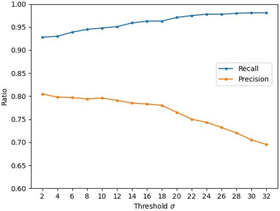 The spatial relationship in spatial information fusion is determined by the threshold parameter in Equation (10). Figure 12 shows the variation in precision and recall for different . From the graph, it can be observed that the accuracy and recall remain relatively stable in the range of 2–18 for . This allows Fm to maintain a high level of measurement accuracy. However, once the threshold value exceeds 18, the accuracy starts to decrease significantly. This is because increasing the threshold expands the spatial matching range, causing more background pixels to be classified as foreground objects, leading to an increase in false positives.
