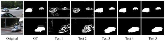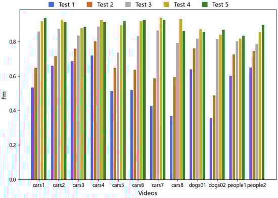 We set up Test1–Test5 to verify the effectiveness of the global motion compensation optimization and the interactive graph cut algorithms (GraphCut, OneCut, and GrabCut) in our method. All three algorithms possess good interactivity and controllability, enabling easy integration with our algorithm to guide them in image segmentation. They all adopt a global optimization strategy, allowing for the consideration of relationships between pixels at a global scale, thereby obtaining accurate segmentation results. We conducted experiments using 12 representative video sequences (cars1–cars8, dogs01, dogs02, people1, and people2) from the FBMS-59 dataset. The qualitative results of the experimental part are illustrated in Figure 13. The quantitative evaluation of Fm values is presented in Figure 14. In addition, the experiments also evaluated the average time performance of the three graph cut methods we used and other graph cut algorithms for single segmentation in the video sequence “cars1” with a resolution of 640 × 480. The results are presented in Table 4.