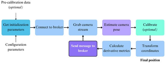 From a software standpoint, the Visual self-localization tool is arranged into two modules: the outer shell and the localization core. In the flow diagram depicted in Figure 2, the localization core’s workings correspond to the “Estimate camera pose” stage, while all the rest correspond to the outer shell of the architecture. Internally, the localization core assumes a local coordinate system. Thus, a transformation from the local coordinate system to the global coordinate system must occur before formatting the output message to the agreed-upon format and sending it via the message broker to the rest of the system. The tool, given the appropriate configuration, can utilize either a perspective or a panoramic camera. The connection to the camera is handled by a UDP proxy server, which constantly reads the camera and exposes its stream to the core module via a network interface. In the localization core of the tool lies a modified version of the Stella-VSLAM C++ library [], which consumes the exposed camera stream and communicates its output to the outer Python shell via a file-based UNIX Domain Socket (UDS). The outer shell constantly receives the camera pose expressed in local units and transforms it into a global GPS position utilizing calibration data in a way described in the following paragraph. Then, various derivative metrics like distance and heading are being calculated, and all the information produced is formatted into a JavaScript Object Notation (JSON) message before being sent to the message broker, closing the cycle.