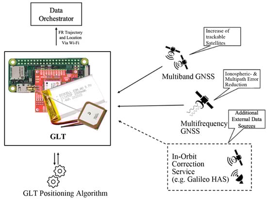 Our proposed Galileo-assisted Localization Tool (GLT) is a multi-band and multi-frequency GNSS-based approach that utilizes a high-precision receiver with a dedicated active antenna. All data processing is performed on a small single-board computer (SBC), making the entire system self-reliant and capable of being powered by a small battery for several hours. One of the primary focuses during the development of our GLT is tailoring it to the needs of FRs in terms of size, weight, and robustness. To prototype the system, we opted for one of the smallest breakout boards available, the SparkFun GNSS receiver board, which features a U-Blox ZED-F9P receiver chip []. For the SBC, we selected a Raspberry Pi Zero 2W, chosen for its compact size and capable processor unit, allowing it to receive and process GNSS data at 2 Hz and wirelessly transmit the data via WiFi to the orchestrator. The GNSS receiver board is connected to the SBC via UART (Universal Asynchronous Receiver/Transmitter). We employ a small GNSS active patch antenna with a low-noise amplifier to receive signals from common GNSS systems such as BeiDou, GLONASS, Galileo, and the GPS at two frequencies.