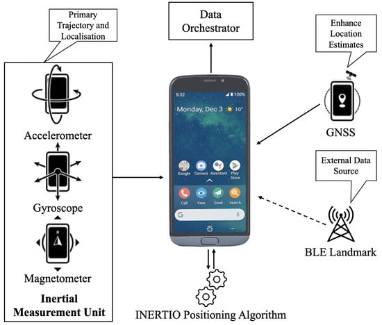 Figure 4 provides a high-level view of INERTIO design architecture. More specifically, it details the various sensor modules to be utilized and fused of an Android-based smartphone to obtain good-quality self-positioning estimates. In line with current state-of-the-art approaches, INERTIO will use the accelerometer, gyroscope, and magnetometer of the smartphone device’s onboard IMU sensors as the primary basis for obtaining the initial position and orientation of the FR. Furthermore, satellite signals of the GNSS from a GLT or the GPS from a smartphone are collected to obtain a GPS location to be used to enhance and correct the predicted position from the IMU sensors. Also, any other additional external data sources available (e.g., landmarks) are to be incorporated into the INERTIO positioning algorithm to further enhance and correct the predicted position of the FR. Lastly, the location and trajectory information derived is outputted via WiFi to be distributed to other mobile phones.