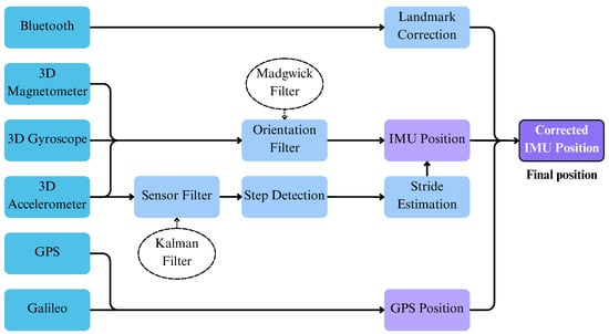 Now, we briefly review some modular localization systems that are targeted at pedestrians. In their study, Chdid et al. [] combined an IMU approach that uses an accelerometer and a gyroscope sensor. The observations generated by these two sensors are fused by means of an extended Kalman filter, which outputs a position estimate. To complement the modularity of their system, the authors also integrated a vision-based component. This latter subsystem generates localization estimations via a pipeline that performs structure from the motion from the observed images. The output of both modules is averaged. This is a low-level fusion operation. Finally, the GPS and heart rate sensor data are combined in order to compute a more robust position estimate. Anacleto et al. [] presented a specialized modular architecture for pedestrian localization. The system incorporates an inertial measurement system with sensors attached to both the foot and waist, including accelerometers, gyroscopes, and additional sensors. GPS and heart rate sensors augment the data to correct the inertial measurements, facilitating low-level fusion. Ultimately, GPS data, heart rate sensor data, and processed signals are integrated into a high-level fusion module to produce the final location estimation. Liu et al. [] used an ultra-wide-band-enabled sensor and introduced a SLAM-based visual processing algorithm. They combined the data generated by both subsystems and then used an extended Kalman filter that estimates a pedestrian’s position. By means of this architecture, the authors tackled the scale ambiguity problem caused by monocular vision. Ali et al. [] presented an indoor localization method that combines inertial measurement units (in particular, an accelerometer and a gyroscope) and an ultra-wide-band-enabled sensor. The authors integrated the information extracted from the raw positioning data from both modules by means of an extended Kalman filter. In their study, they also explored and analyzed the use of an adaptive Kalman filter for position prediction. According to the authors, their pipeline can fix position and orientation drift. In this case, the drift can be caused by the sensor interference and orientation dissensus originating from the inertial sensors. Chen and Hu [] provided in their work a rigorous mathematical modeling analysis of how to combine inertial data and GPS location signals. The inertial measurements that they considered are generated by an accelerometer and a sensor that captures the angular rate of the foot. Their method is suited to outdoor localization. Huang et al. [] introduced a unique methodology in which they employed inertial sensor measurements, together with Bluetooth and a light sensor, for human localization. The method proposed by the authors has four modules, namely a “data acquisition” module, a “motion model” module, a “light model” module, and a “decision making” module. The data acquisition component collects the motion data from inertial sensors and the light sensor, capturing positional human commute events. In the design of this last method, the decisionmaking module performs a higher-level analysis of the output of the modules by means of step-length modification, sub-edge heading reset, and pedestrian position revision.
