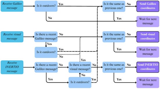Second, if the GLT indicates that we are indoors and there is a recent visual localization message available, we utilize that. Favorable behavior of the Visual self-localization tool is that, when it loses tracking, for example, due to the bad lighting conditions or a series of very sharp motions, and thus cannot infer position, it does not emit any messages. Therefore, its last message will become obsolete soon enough and will play no role in the fusion selection procedure. Finally, if there is no preferable solution available, the algorithm resorts to using INERTIO as it always produces an output. When the Fusion tool receives a valid message again from a modality with higher priority, it switches back to that, continuing the operation in this iterative manner. The aforementioned strategy is better explained visually in Figure 6.