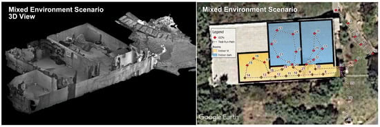 To validate our proposed fusion approach, we conducted surveys to establish ground truth through two distinct methods. Outdoor ground control points (GCPs) were surveyed using a real-time kinematic GNSS, achieving a mean horizontal accuracy of 1 cm. The designated outdoor GCPs are numbered 1 to 7 and 35 to 37 and distributed near the building used for the experiments. Indoor reference points were established based on an IPS (refer to Section 2.4) trajectory obtained during an inspection run. In the confined bunker space, GCPs 8 to 34 were selected to provide comprehensive indoor coverage. During the IPS survey, each indoor GCP was carefully marked, and the IPS device was precisely positioned at each point. The IPS utilizes inertial measurements, visual odometry techniques, and a stereo camera system for 3D orientation and position estimation, generating a real-time geo-referenced trajectory calibrated over outdoor GNSS-surveyed GCPs. However, it is important to note that the accuracy of indoor reference points, estimated at approximately 30 cm per point, is lower compared to outdoor GNSS points due to the IPS’s decreasing accuracy over time. This value is attributed to the closed-loop error of the IPS system, which we have determined to be around 30 cm. We acknowledge that achieving higher accuracy indoors would have been possible using tachymeter or total station survey equipment; however, for our specific case, this level of precision was not necessary and would have required significantly more effort. It is worth mentioning that, during the IPS survey, we also obtained a detailed 3D model of the operational area as a beneficial byproduct (see Figure 7 left).