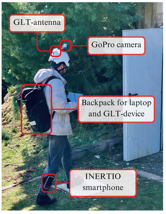 An actual view of the experimental setup is provided in Figure 8. The camera of the Visual self-localization tool, as well as the GLT antenna, are mounted on the helmet. The smartphone for INERTIO is strapped at the leg of the FR, and it also carries the GLT device and the laptop hosting the message broker, the Visual, and Fusion localization tools.