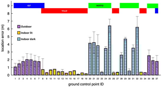 Location error at ground control points (GCPs). Five test runs were conducted. The overlaid error bars indicate one standard deviation around the mean values. The 37 GCPs are divided into 3 distinct sectors: 11 of them are situated outdoors, 15 indoors at a well-lit area, and 11 indoors at a dark area. Traversing the full route should trigger six source modality transitions. On the upper section of the chart, we can see the actual source modality used by the Fusion self-localization tool. Note that GCPs 8 and 37 were localized by more than one modality across the runs.