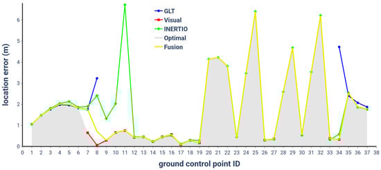 The location error at the GCPs was assessed over five test runs. Figure 9 illustrates the distribution of the mean location error, with the error bars indicating the measurement variance. In the upper section of the chart, insight into the source modality transitions triggered during the traversal of the full route is provided. Table 1 provides a summary of the location error for all the self-localization tools, taking into account only the location estimations utilized by the Fusion tool in each run. On the other hand, Table 2 presents the location error for the individual localization modalities, considering the partial availability of the tools at the various GCPs. Specifically, the INERTIO tool demonstrates full availability at all 37 GCPs, indicating consistent data availability. The visual data are predominantly available in lit indoor areas where the SLAM model acquisition was carried out. Note that we could set the Visual self-localization tool to also provide estimations outside of the acquired SLAM model but deemed it unnecessary due to the given availability of the other two localization modalities. The GLT data, on the other hand, are primarily available outdoors. Lastly, Figure 10 showcases the individual tools’ location error values at all the GCPs, plotted together with the Fusion tool’s actual error and the theoretically optimal value had it chosen the correct source modality at all times. Indeed, in the frame of our study, the Fusion self-localization tool seems to make the optimal modality choice at 35 out of the 37 GCPs, where at all times there are at least two modalities available for use. The two GCPs where the Fusion tool fails to pick the most accurate modality are the transitional ones (7 and 8), right upon entering the concrete building. This indicates a reactance on behalf of the selection mechanism to release the GLT and turn sooner to the Visual localization tool, behavior related to the indoor/outdoor detection mechanism. Before we delve into the analysis of the results, we should underline the fact that all the measurements were taken at the position of an FR upon arrival at the designated ground control points, and, as a consequence, there is some tolerance to their precise position due to their perception and body pose, unavoidably adding some noise to the results.