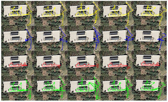 As regards the setup of the Visual self-localization tool, in order to save valuable time and speed up the processes, we chose to run the tool in the pre-calibrated mode. To facilitate this, we visited and traversed the indoor spaces of the operational area one hour prior to the tests, storing the derived raw SLAM model for later use. Immediately afterwards, we calibrated/mapped the raw SLAM model to reality by conducting the 3-point calibration procedure described earlier. As calibration points, we utilized the GCPs numbered 8, 14, and 17 along the tracing path.