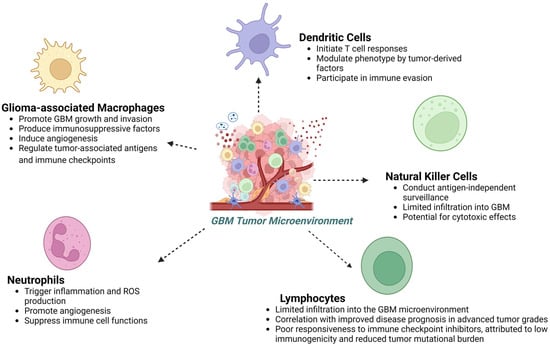 | Glioma-associated macrophages (GAMs) | Constitute up to 30–40% of the bulk tumor mass in GBM. Exert pro-tumorigenic activities by releasing various factors [86,87]. |