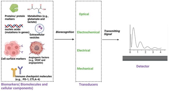 | Electrochemical biosensors [294,295,296,297] | Detection based on electrical signal changes includes alterations in current, voltage, impedance, or capacitance, depending on the nature of the electrochemical transduction mechanism resulting from analyte binding to bioreceptors immobilized on electrodes. | Enzymes, DNA, antibodies, whole cells. |