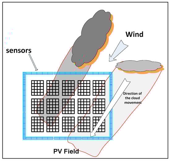 Let us consider a field filled with rectangular solar panels arranged arbitrarily. The field is surrounded by sensors placed along the borders of some figure, with each sensor labeled by an index j. We introduce a coordinate system x and y, with the sensors having coordinates (). Each solar panel is numbered k, and all panels together form a single solar panel. It is assumed that each panel is small and can be covered by clouds or not. Let the clouds move at a constant speed V (, ) with an arbitrary shape. At every moment of time , the sensors indicate the presence or absence of a cloud. The objective is to determine the area of the panel covered by clouds, the length of time it is covered, and the power loss incurred, depending on the sensor readings. In this setting, the panels serve as an element for dividing the area of the solar panel.