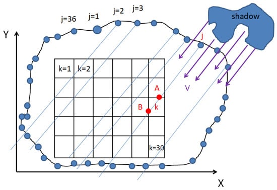 In Figure 2, a sensor with index is characterized by coordinates and it has detected a shadow at the specific moment The point where the shadow is measured will intersect a panel element with index at points A and B. Consequently, the coordinates of these intersection points are represented with the indexes i, j, and k.