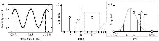 Although there is a deviation between the selected time pulse τ1 and the real-time delay τ, this deviation is further smaller than the time resolution. Specifically, the real-time delay τ is always located in the vicinity of the selected time pulse τ1. Therefore, it is feasible to determine the real-time delay τ by comparing the inverse Fourier transform results of all available time points near the selected time pulse τ1 within the interval [τ1 − ∆t′, τ1 + ∆t′]. Based on the theory of Fourier transform, the absolute value of the inverse Fourier transform results should reach its maximum of 0.5 at the real-time delay point τ. Meanwhile, the absolute value of the inverse Fourier transform for other time points, especially the selected time pulse τ1, should be smaller than that of the real-time delay τ. The inverse Fourier transform of other time points near τ1 can be generated by utilizing a time-shifting parameter ts, which can be calculated by: