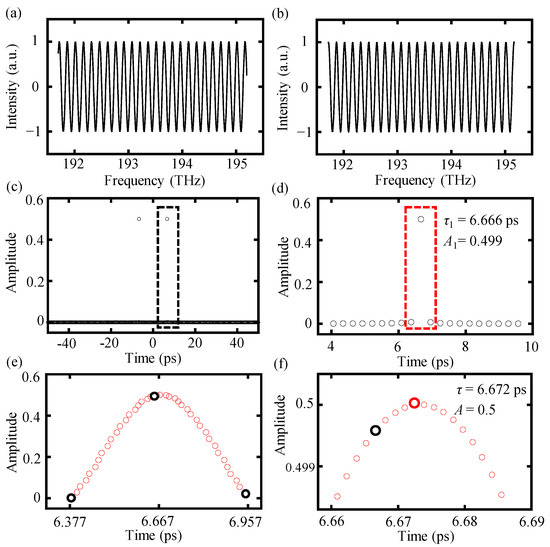 The data processing procedure of the time-shifting algorithm. (a) Original modified spectral interference signal Im(fk) for a target distance of 1 mm, with the spectral frequency ranging from 191.7 THz to 195.2 THz, (b) truncating the interference signal within integer periods, (c) inverse Fourier transform results of the truncated signal, and data points in the dot black frame contains the selected time pulse τ1, and (d) magnification of the results in the black frame of (c) and the selected time pulse τ1 value can be checked as 6.666 ps. This time pulse is picked up based on the maximum absolute value of the inverse Fourier transform results among all the available points in the time axis. Furthermore, the red frame highlights the selected time pulse τ1 and the two adjacent time points, i.e., τ1 ± ∆t′, (e) inverse Fourier transform results of the time-shifting algorithm. Three black circles represent the inverse Fourier transform results of the original three time points in the red frame of (d), obtained by the conventional algorithm. The middle black circle is the selected time delay pulse τ1. The red circles represent the inverse Fourier transform results of a sequence of time points near the selected time pulse τ1, obtained by the time-shifting algorithm, (f) amplification of the central region (e). The real-time delay τ, highlighted as the block red circle, is positioned by searching for the maximum absolute value of the inverse Fourier transform results among the time-shifting sequence.