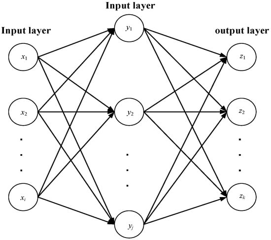BPNN is a widely used artificial neural network algorithm, typically consisting of three layers of neurons: the input layer, hidden layer, and output layer []. The number of nodes in the hidden layer is usually determined by the empirical formula where N represents the number of nodes in the hidden layer, N1 represents the number of nodes in the input layer, and N0 represents the number of nodes in the output layer []. The topology is illustrated in Figure 1.