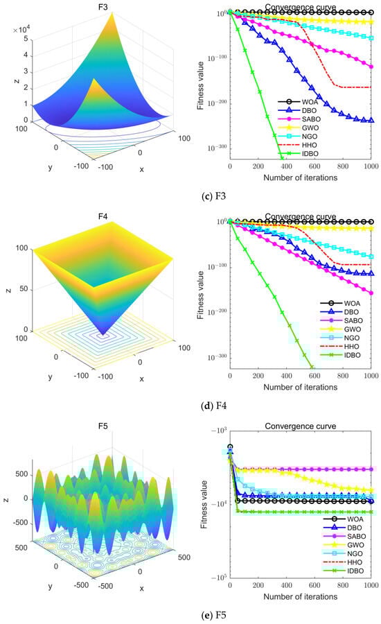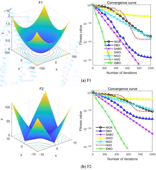 In order to evaluate the optimization performance of IDBO, the CEC2005 test set is utilized for iterative testing in the Matlab R2023a environment. The algorithm is compared with the Whale Optimization Algorithm (WOA), Subtraction Average Based Optimizer (SABO), Grey Wolf Optimizer (GWO), Northern Goshawk Optimization (NGO), Harris Hawk Optimization (HHO), and the original DBO. Each algorithm’s population size and maximum number of iterations are set to 30 and 1000, respectively, with the test being repeated 30 times. The details of the test function information can be found in Table 1.