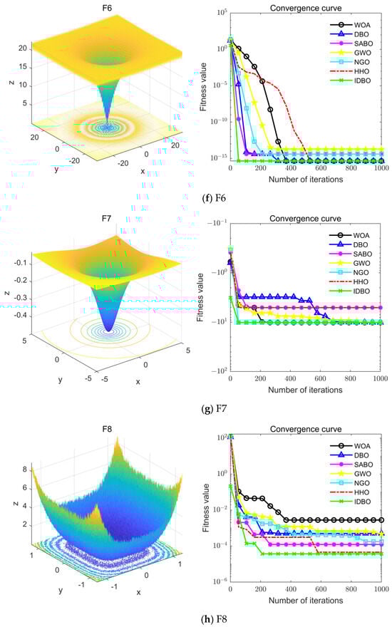 The seven algorithms are tested by eight different functions with optimal value, standard deviation, average value, median value, and worst value as evaluation indices, which reflect the convergence accuracy and stability of the algorithms, as shown in Table 2. As can be seen from Table 2, IDBO can accurately find the optimal value 0 in various functions, which can adapt to the transformation in global exploration and local exploration. Therefore, compared with other algorithms, IDBO has improved the accuracy of the solution and is more stable in average optimization performance.