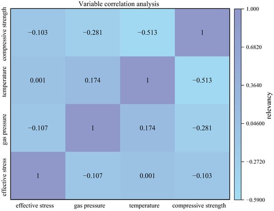 The correlation analysis chart is a method used to visually represent the distribution of data and the relationship between different factors. In order to accurately capture the impact of different factors, SPSS 27 software was used to perform correlation analysis on the initial data concerning the factors influencing coal gas permeability. This analysis aimed to generate the Pearson correlation coefficient matrix for various indicators, as illustrated in Figure 3. The positive and negative signs in the correlation coefficient indicate the direction of the correlation between variables. A positive correlation coefficient indicates a consistent trend of change between two variables; specifically, when one variable increases, the other variable also increases. A negative correlation coefficient indicates an opposite trend in changes between two variables. This means that when one variable increases, the other variable decreases. According to Figure 4, a negative correlation is observed between effective stress and gas pressure, compressive strength and gas pressure, as well as temperature and compressive strength. Conversely, a positive correlation exists between temperature and effective stress, as well as between temperature and gas pressure. The closer the absolute value of the correlation coefficient is to 1, the stronger the relationship between the variables. A correlation coefficient of 1 indicates a perfect positive correlation, while a correlation coefficient of −1 indicates a perfect negative correlation. A correlation coefficient close to 0 suggests that there is no linear correlation between the two variables. These findings are important for understanding and analyzing relationships between variables in academic research. As shown in Figure 4, the correlation between coal body gas permeability and the influencing factors is not entirely linear; there is a slight correlation between the index factors. For instance, the correlation coefficients between effective stress and gas pressure, temperature, and compressive strength are −0.107, −0.001, and −0.103, respectively. This suggests a limited association among these factors in influencing coal gas permeability. The correlation coefficient between gas pressure and temperature is 0.174. When the correlation value between the two factors is too low (e.g., less than 0.2), it indicates that it may be less helpful for information enrichment. If used directly, it will inevitably affect the result to some extent. Therefore, it is essential to conduct kernel principal component analysis on the original data, which can not only reduce the amount of calculation but also improve the accuracy of model prediction.