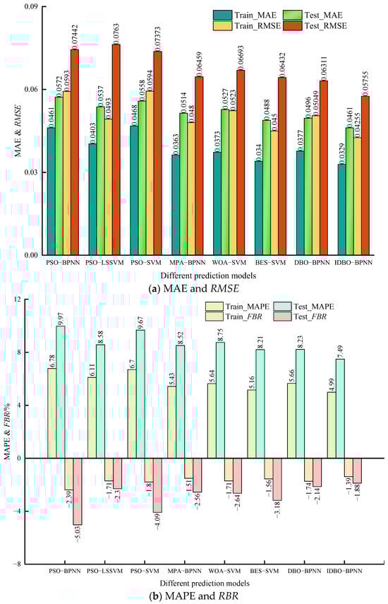 (3) The original data and principal component data were used as model inputs. The prediction results of the IDBO-BPNN model were compared with those of the PSO-BPNN, PSO-LSSVM, PSO-SVM, MPA-BPNN, WOA-SVM, BES-SVM, and DPO-BPNN models. The results indicate that using the principal component data can effectively improve the model’s prediction accuracy compared to the original data. This suggests that KPCA can effectively help concentrate the data. Secondly, when utilizing principal component data, the MAE of the IDBO-BPNN model in the test samples decreased by 0.0399, 0.0341, 0.0286, 0.0121, 0.021, 0.0188, and 0.0134, respectively, in comparison to other models. The MAPE decreased by 5.61%, 5.55%, 4.19%, 2.01%, 3.14%, 2.5%, and 1.95%. Additionally, the RMSE decreased by 0.0476, 0.0338, 0.0376, 0.0112, 0.023, 0.0185, and 0.012, respectively. R2 was increased by 0.098, 0.0577, 0.0679, 0.0127, 0.033, 0.0244, and 0.0139, respectively, while MSE was decreased by 0.0039, 0.0023, 0.0027, 0.0005, 0.0013, 0.0009, and 0.0005, respectively. FBR decreased by 2.53%, 4.1%, 2.51%, 1.2%, 1.94%, 2.77%, and 1.49%, respectively. The results indicate that the IDBO-BPNN model demonstrates superior quality, minimal error, and strong fitting performance. Furthermore, it suggests that IDBO significantly enhances global search capability and optimization accuracy compared to the original DBO. As a result, BPNN demonstrates higher prediction accuracy.