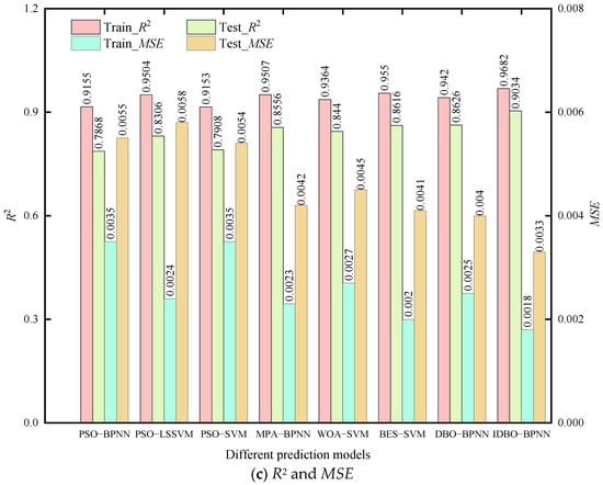 According to the literature [], the PSO-BPNN model is constructed, and the thresholds and weights of BPNN are optimized using PSO. The PSO-LSSVM model was constructed based on literature [], and the two parameters γ and σ in LSSVM were optimized using PSO. Based on reference [], the PSO-SVM model was constructed, and the penalty parameters and kernel parameters in SVM were optimized using PSO. Additionally, the Marine Predators Algorithm (MPA) optimizing (BPNN) models (MPA-BPNN) was developed based on reference []. Furthermore, the WOA-SVM model was developed based on literature [], while the Bald Eagle Search (BES) optimization SVM model (BES-SVM) was constructed according to reference []. These optimization models are compared with IDBO-BPNN and DPO-BPNN models constructed by the author, with parameter settings for each optimization model shown in Table 6.