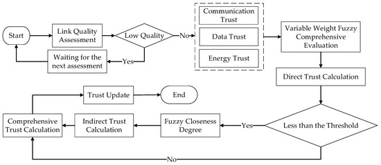 Figure 1 depicts the workflow of the ATEM, which includes the five main steps listed below: (1) link quality assessment; (2) direct trust computation; (3) indirect trust computation; (4) composite trust computation; and (5) trust update.