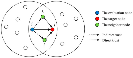 The evaluation process begins by screening the recommended trust values of common neighboring nodes, followed by weight allocation according to the deviation of these nodes’ recommended trust values. Ultimately, the indirect trust value can be obtained using the following calculation formula: