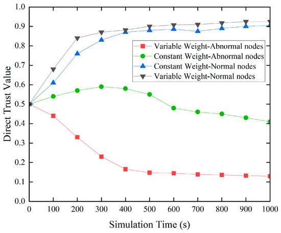 Due to the data tampering attacks launched by malicious nodes, their data trust values tend to be relatively low. Therefore, in the variable-weight fuzzy synthesis evaluation algorithm, data trust indicators are assigned higher weights to highlight their impact on trust evaluation results. However, in the constant-weight algorithm, the weight of each trust indicator is set to a fixed value based on experience. This may lead to a situation where the final direct trust value remains high when other trust indicator values are high, failing to intuitively reflect the impact of defective trust indicators on trust evaluation results. As shown in Figure 3, when using the variable-weight algorithm, the trust of anomalous nodes rapidly decreases, demonstrating the algorithm’s rapid response to abnormal behavior. However, in the constant-weight algorithm, the presence of other trust indicators weakens the impact of defective trust indicators on trust evaluation results, resulting in a slow decline in trust values. Nevertheless, both algorithms perform well in reflecting the trust values of normal nodes. This result validates the effectiveness of the variable-weight algorithm in improving the performance of the trust model.