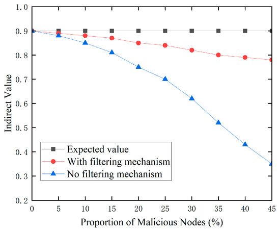 Figure 4 indicates that when the proportion of malicious nodes grows, the indirect trust ratings of regular nodes fall considerably under bad-mouth assaults. It is worth mentioning, however, that the proposed suggestion filtering strategy has only a little impact on indirect trust ratings. This is because, without a filtering mechanism, each node’s proposal value is treated equally, and all recommendation information in the network is accepted unconditionally. As the proportion of malicious nodes rises, so does the amount of incorrect information in the suggestion sequence. This has a significant impact on indirect trust scores. In contrast, the proposed filtering strategy is crucial for determining the appropriate trust levels. Using fuzzy closeness theory, this system successfully finds and filters out untrustworthy suggestion information, assuring the correctness and dependability of indirect trust ratings. This result clearly demonstrates the effectiveness of the proposed anomalous node detection strategy in countering bad-mouth assaults.