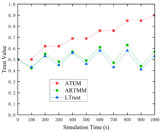 In this section, we established a simulation environment using MATLAB R2020b to conduct experimental simulations on ATEM and performed comparative analysis on its performance. In the experimental setup, 100 nodes were randomly deployed within a 1000 m × 1000 m × 1000 m area, following the MCM model for mobility [19]. The communication range of each node was set to 400 m. First, our main goal was to investigate how the trust model’s performance is affected by the variable-weight fuzzy comprehensive evaluation technique. Experimental verification indicated the algorithm’s great usefulness in improving trust evaluation accuracy and dynamic flexibility. We then validated the usefulness and accuracy of the suggestion filtering method using fuzzy set progress theory. The experimental findings show that this technique may successfully filter out false suggestion information, increasing the overall reliability of trust evaluation. Finally, we evaluated the proposed ATEM against two existing trust models, ARTMM and LTrust. The comparative experimental findings support the benefits of ATEM in trust evaluation for UASNs. The specific simulation parameters are shown in Table 1.