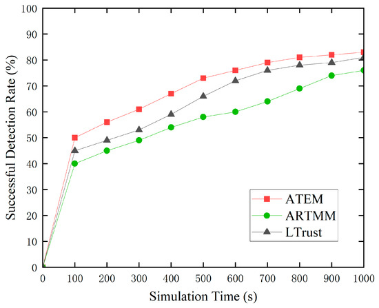 To provide a more complete picture of ATEM’s performance, we ran a detection success rate test with a high malicious node rate of 30%. Under the influence of poor link quality, typical node trust values may fall below 0.5, and trust values from previous cycles may have an impact on the current cycle’s trust values. As the cumulative effect of low connection quality builds up, trust ratings continue to fall, potentially leading to more normal nodes being misclassified as malicious. However, as seen in Figure 6, the ATEM trust model successfully mitigates the fall in trust values of normal nodes by pausing trust value updates during periods of low connection quality. This reduces the possible influence on future trust value evaluations, considerably minimizing the chance of misidentifying normal nodes as malicious ones. As a result, in the ATEM trust model, there is a big disparity between the trust ratings of most normal nodes and malicious nodes, which leads to a significant increase in the success rate of harmful node identification. This finding indicates the ATEM trust model’s improved performance and stability in complicated network contexts.