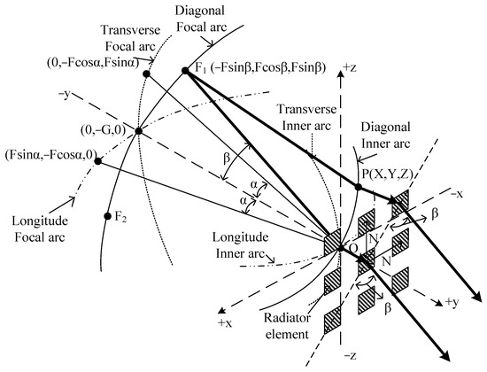 The three-dimensional Rotman lens has three focal arcs, i.e., longitudinal, transverse, and diagonal arcs. A longitudinal or transverse Rotman lens can be designed using the general method. Longitudinal and transverse Rotman lenses designed using the previous formula are combined at the on-axis focal point G (−G,0,0) on the x-axis. The z-axis and the angle of the diagonal beam tilt must be considered when designing a diagonal Rotman lens.