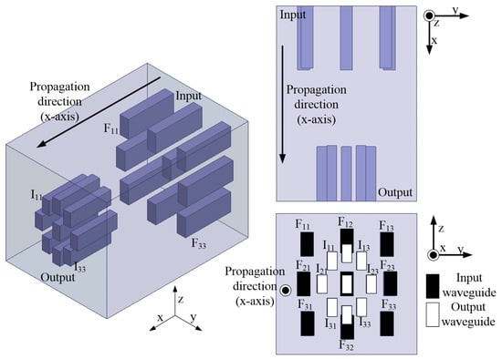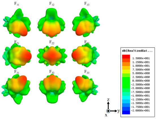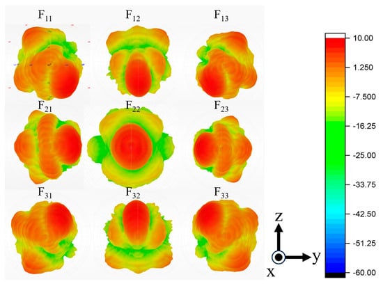 Figure 6 shows the results of simulations of the radiation patterns for all nine input ports. The gains and beam tilt angles are summarized in Table 2. The radiation pattern for each input exhibits symmetrical beamforming based on F22 of the central input. The absolute values of the beam tilt angles in the longitudinal, transverse, and diagonal directions are 20°, 25°, and 17°, respectively. F22 of the central input port exhibits the highest gain of 9 dBi. F11, F13, F31, and F33 of the diagonal Rotman lens have the lowest gains of 1.6 dBi. The beam tilt angle is 5°, i.e., not as designed. There are two reasons for this error. First, the incident wave was delivered from the input waveguide to the free space, not to the output waveguides, during simulation; the radiation pattern combines the radiation power in the free space. The tuning of the waveguide positions may also have been associated with some error. The proposed Rotman lens engages in three-dimensional beamforming at each input port, although the output phase and beam tilt angle contain errors.