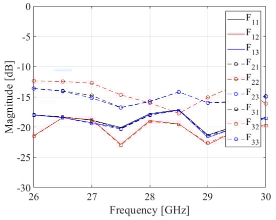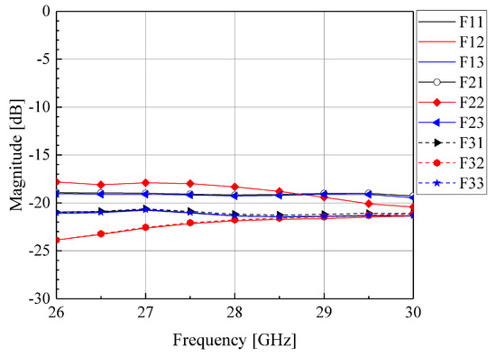 Figure 8 shows the simulated results. The x-axes are the frequency in GHz and the y-axis is the magnitude of the reflection coefficient. Five curves are drawn for each feeding input port. As shown in the figure, the reflection coefficient is below −15 dB at 28 GHz.