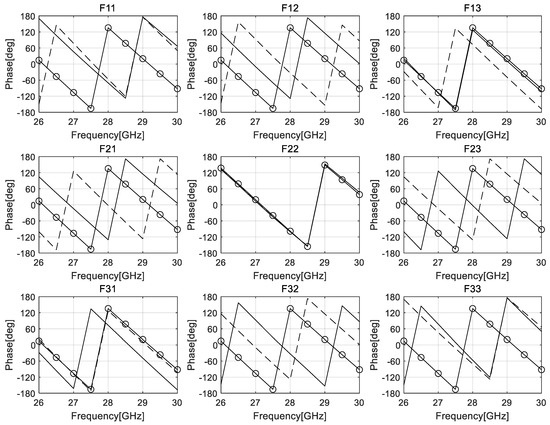 The curves in Figure 4 show the phase differences between the focal arc input and the inner arc output. The three-dimensional Rotman lens consists of four two-dimensional Rotman lenses placed in the longitudinal and transverse directions, and at two diagonal positions, by reference to F22 of the central input port. The output phase differences between the focal and inner arcs of all two-dimensional Rotman lenses were analyzed.