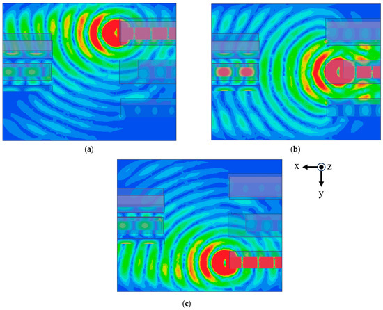 Simulation results for the electric field of a three-dimensional waveguide Rotman lens: (a) input = F11, (b) F22, and (c) F33.