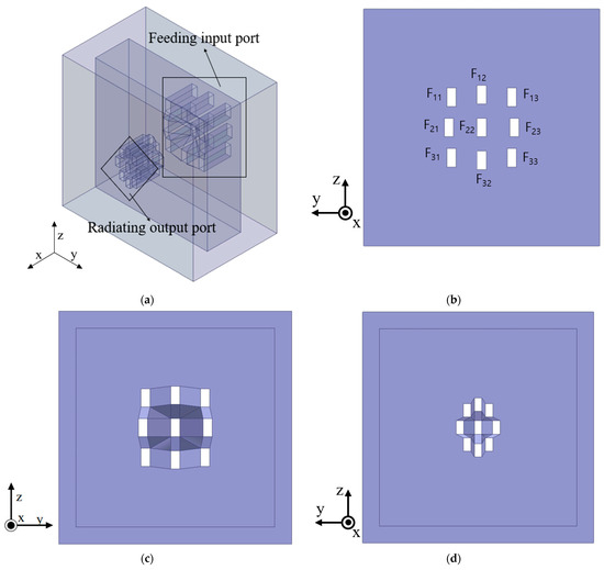 Figure 7 shows a transparent view of the proposed volumetric Rotman lens antenna. The feeding waveguides are shown on the left, and the radiating apertures (open-ended waveguide antenna) are shown on the right. The aperture of the waveguide follows the general standard of WR-34 of 8.64 × 4.32 mm. The inner spacing of the proposed antenna is filled with air, and the absorbing material is attached to the inner wall to remove the reflected wave from the conducting plate. The input port is indexed, as shown in Figure 7b similar to the Figure 2.