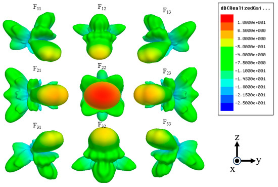 The radiation pattern for each input port was simulated, as shown in Figure 9. As indicated by Figure 9, the beam pattern for the central axis shows the on-axis beam. The direction is tilted depending on the feeding point. In summary, the beam direction in the azimuth and elevation angles (φ, θ) are (−16°, −17°), (0°, −25°), (16°, −17°), (−20°, 0°), (0°, 0°), (20°, 0°), (−16°, 17°), (0°, 25°), and (16°, 17°) for beam indices 1–9, respectively. There are some differences compared with the designed goal, but they are considered acceptable considering the broad beamwidth of 20°.