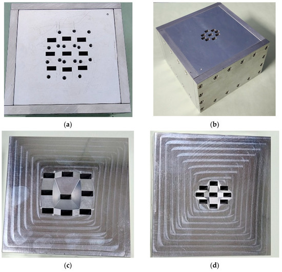 Fabricated volumetric Rotman lens antenna: (a) outside view of feeding waveguide, (b) outside view of radiation aperture, (c) inside view of feeding waveguide, and (d) inside view of radiating aperture.