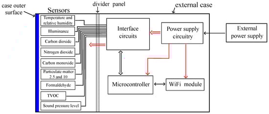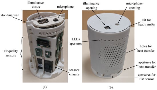 The sub-blocks of the system have been arranged as shown in Figure 2a, where the internal parts of the multi-sensor are visible. Temperature, relative humidity, and air-quality sensors have been placed on a vertical V-shaped mount to keep their sensitive elements as close as possible to the internal surface of the case. In such a way, a representative assessment of the physical quantities monitored by the device can be achieved. Conversely, the illuminance sensor and the microphone have been positioned on a different support on top of the structure to affect their spatial responsivity as little as possible. Light Emitting Diodes (LEDs) have also been implemented as two clusters of ten units per side to provide end users with visual feedback regarding the monitored environment. All the remainder sub-blocks shown in Figure 1, i.e., the interface circuits, the microcontroller, the power supply, and the WiFi module, have been placed on the opposite side of the structure, thus being not visible in Figure 2a. Finally, a dividing wall thermally separates the exploited sensors from potential sources of heat, which can be microcontrollers, WiFi modules, and power supply circuitry.