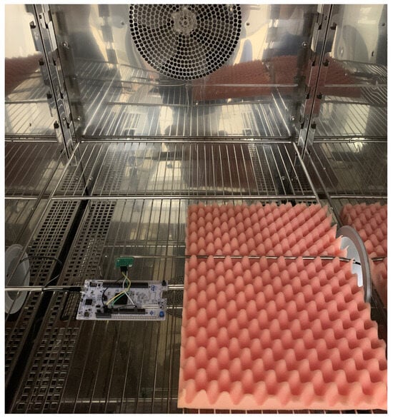 For the air temperature measurements, both the sensor and the reference Pt100 were placed inside the climatic chamber, and the set points of 10 °C, 20 °C and 30°C were tested since they represent the most suitable conditions for the sensor range of use. The sensor was connected to the microcontroller, and this was connected to a PC. The reference Pt 100 sampled one data point every 30 s. Thus, the data sampled every second through the sensor were averaged over 30 s, for a total of about 12 min for each temperature setting. The measurement set-up inside the climatic chamber is shown in Figure 3.