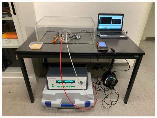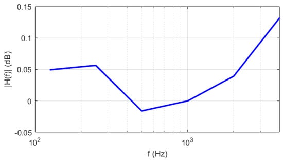 The MEMS microphone (ST-IMP34DT05—STMicroelectronics, Geneva, Switzerland) is verified by comparison to a reference class-1 microphone (NTI MC230A—NTi Audio, Schaan, Liechtenstein) in the anechoic chamber of Politecnico di Torino, which has a volume of 144 m3 and a background noise level of 17.3 dB(A). The NTI microphone was calibrated against sound pressure calibrator B&K, assuming 94 dB at 1 kHz. Both microphones were exposed to the same free-field sound pressure, and the free-field sensitivity of the microphone under-test was evaluated with respect to the free-field sensitivity of the reference microphone. The source B&K Sound Power Source type 4205, thanks to a metallic scaffold, allowed to place the MEMS and the NTI at the same position and at a distance of 7.5 cm from the loudspeaker, which emitted a stationary white noise both broadband (100 Hz–10 kHz) and narrowband for each octave band from 125 Hz to 4 kHz. The sound pressure level at the microphone position was higher than the background noise level of more than 30 dB for each frequency band. The acoustic centers or reference points of both microphones were positioned at the same measurement point with the specified angle of incidence of 90°. Since the manufacturer of the MEMS microphone states an uncertainty of , which is higher than the required uncertainty (), it was chosen to perform the metrological characterization of the MEMS microphone.