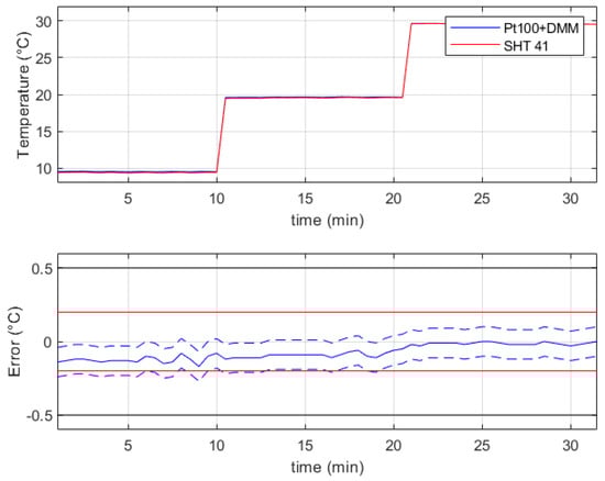 The results that refer to the verification of the temperature sensor Sensirion SHT41 in the range from 10 °C to 30 °C are summarized in Figure 6, where the top chart shows the reference values (blue line) and the measurements of the device under verification (red line). The bottom chart of the same figure reports the measurement error E (continuous blue line) as the difference between the indications of the sensor SHT41 and the reference values, while the couple of dashed blue lines represent the error E summed to the expanded uncertainty of the error. One should note that the compliance of the sensor under verification to its stated uncertainty (a couple of continuous red lines) cannot be stated with high reliability since the quantity is lower than the lower tolerance of the sensor. However, the device under verification passed the test with respect to the required uncertainty (a couple of continuous black lines) that is ±0.5 °C.