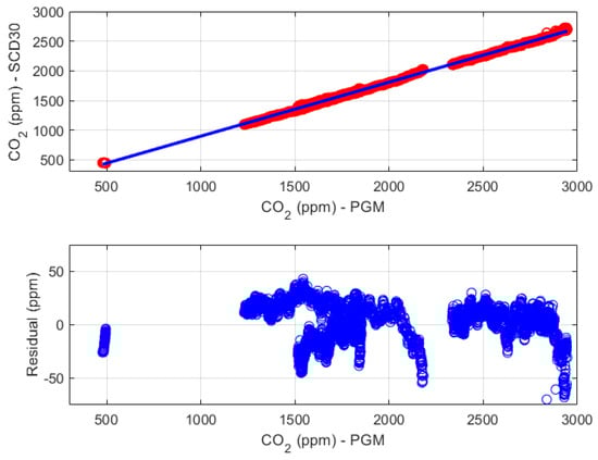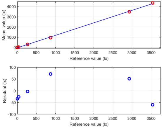 Characterization results for the illuminance measurement chain obtained using the LED with the correlated color temperature of 2700 K. In the top chart the red circles represent the couples of reference and measured values, while the blue line is the linear calibration function. The bottom chart reports the residual fitting errors (blue circles). Taken from [].