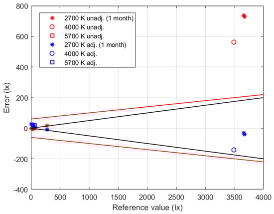 For the measurement chain of the illuminance , the manufacturer states a maximum relative admitted error of , which is larger than the required relative uncertainty of . For this reason, a preliminary characterization of the illuminance measurement chain was performed to identify its calibration function. Such a characterization has been performed using the results provided by the LED with the correlated color temperature of 2700 K (warm white), which exhibits a spectral response with a maximum sensitivity that is close to the maximum of the photopic human sensitivity . The obtained results are summarized in Figure 7, where the red circles in the top chart are the couples of reference and measured values, while the blue line is the linear calibration function (intercept –35 lx; slope 1.22 lx/lx) that was identified through the minimization of the root square sum of the difference between the function and the experimental values. In the same figure, the bottom chart reports the residual fitting errors, which show a negligible mean value and a root mean square error of about . Combining this contribution to the uncertainty specifications of the reference luxmeter, the expected uncertainty of the adjusted illuminance chain was evaluated, which can be expressed at a confidence level of 95% as: